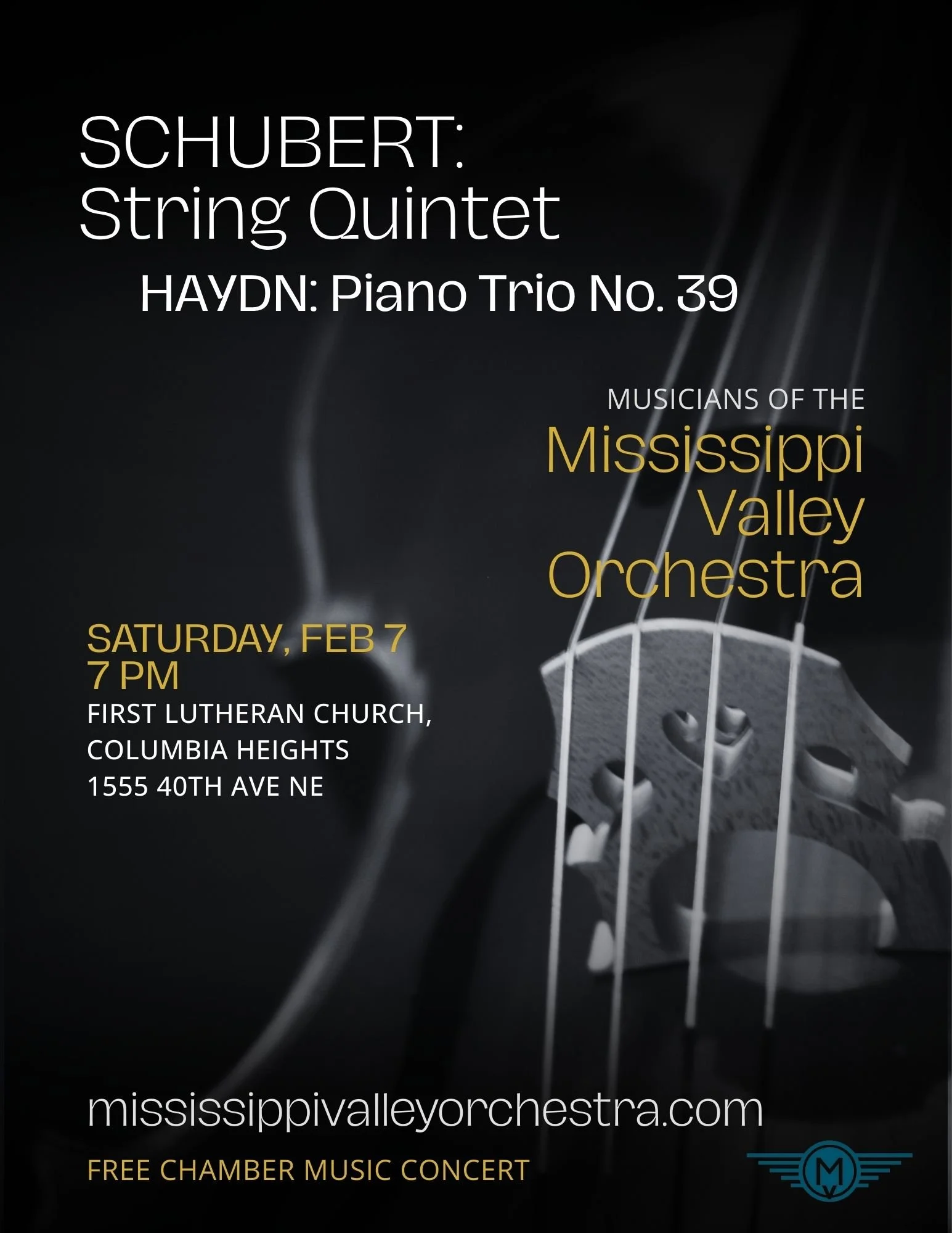 First Lutheran Church of Columbia HeightsMVO Chamber Players return with Haydn’s charming Piano Trio No. 39 and Schubert’s richly expressive String Quintet in C Major, featuring the warm sonority of two cellos.